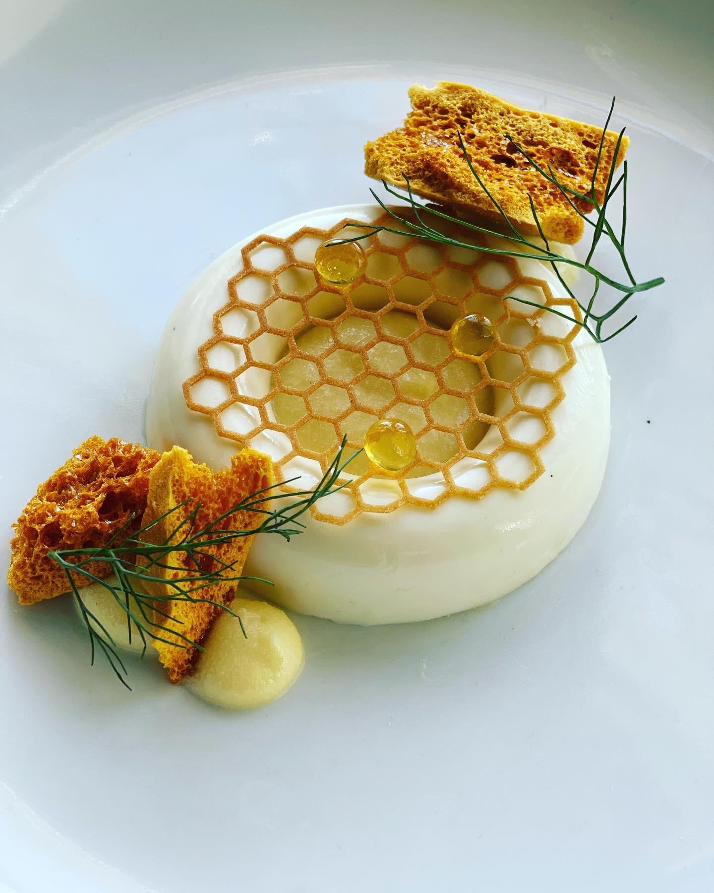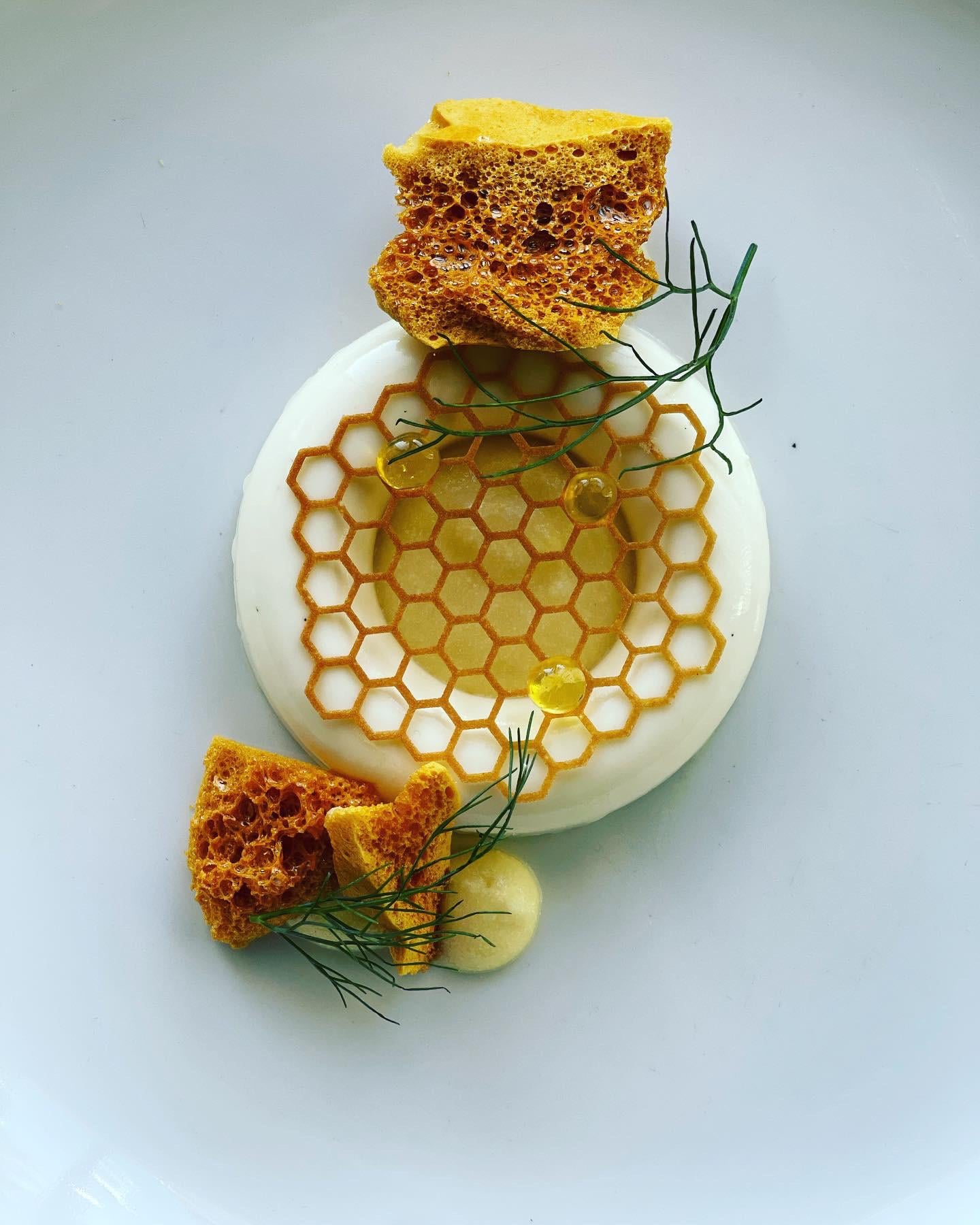 ・ハニカム模様のクリスプ、蜂蜜パール、フェンネルの葉が乗った芸術的な一皿