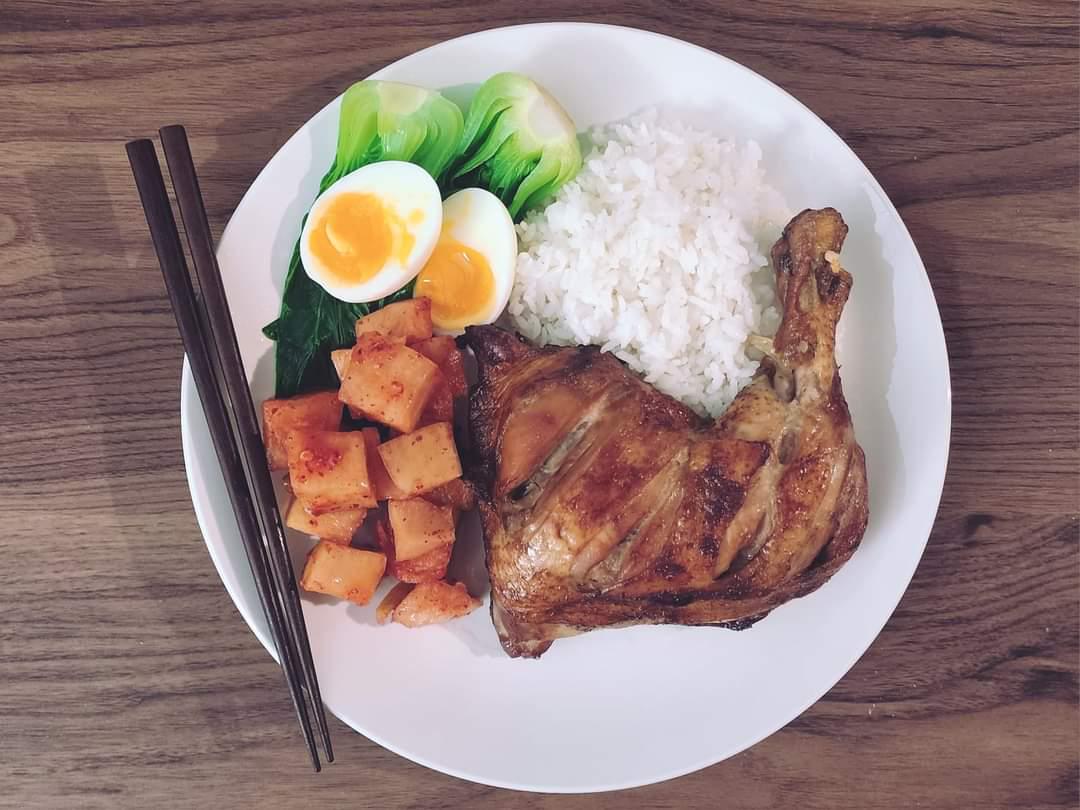 オイスターソース照り焼きチキン、白米、茹でチンゲン菜、半熟卵、そして約2週間漬け込んだ手作りカッタルギ。