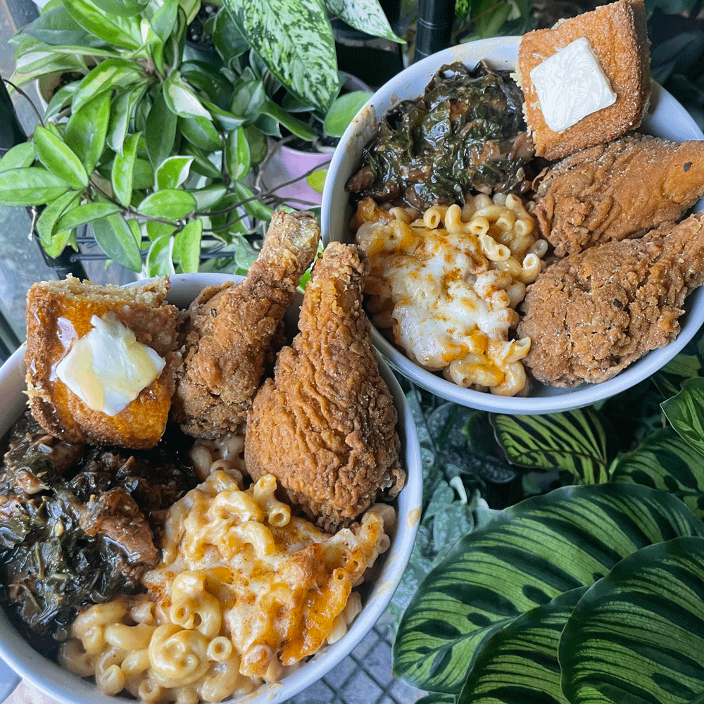 ・フライドチキン、ベイクドマカロニ、コラードグリーン、コーンブレッド、バナナプディングが勢揃い