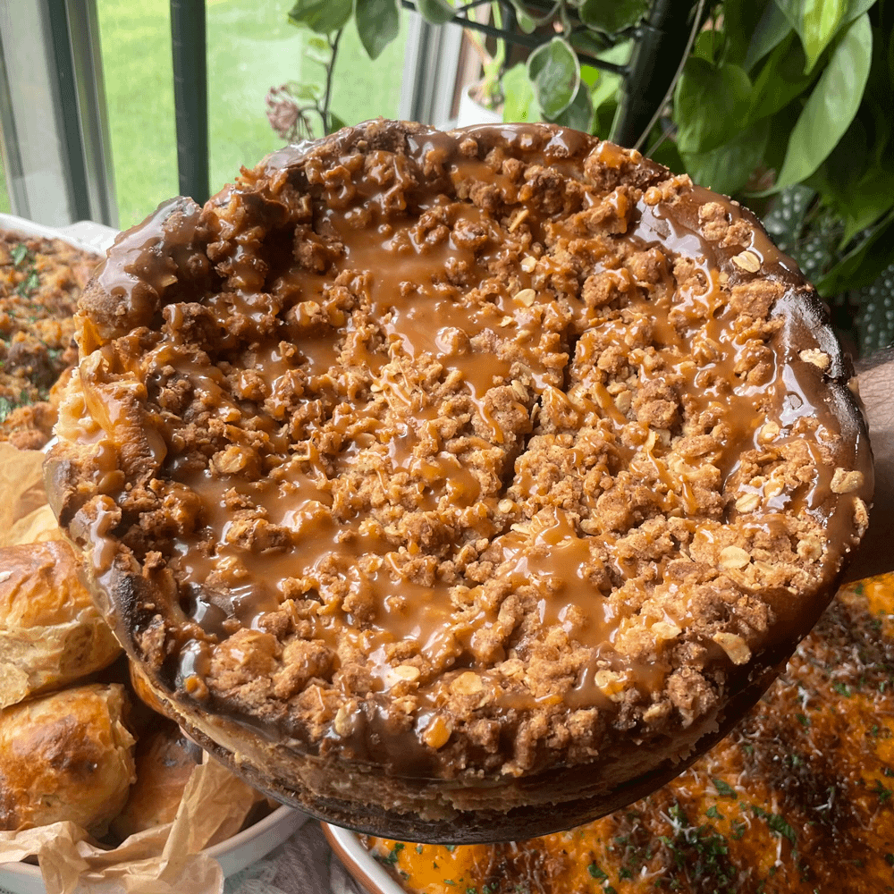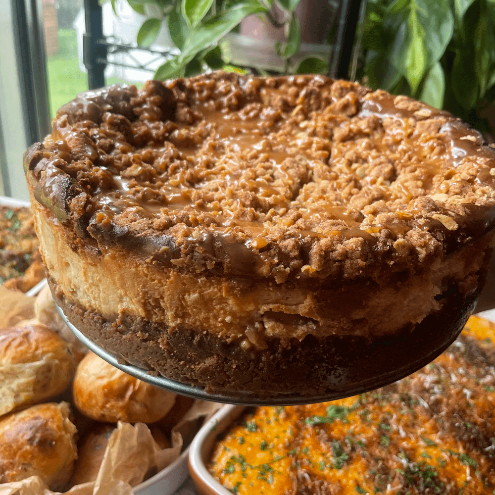 ターキー、ローストガーリックマッシュポテト&グレービーソース、焼きマカロニ、セージのディナーロール、インゲン豆、ソーセージスタッフィング、そしてデザートにアップルクランブルチーズケーキ(Apple Crumble Cheesecake)まで。