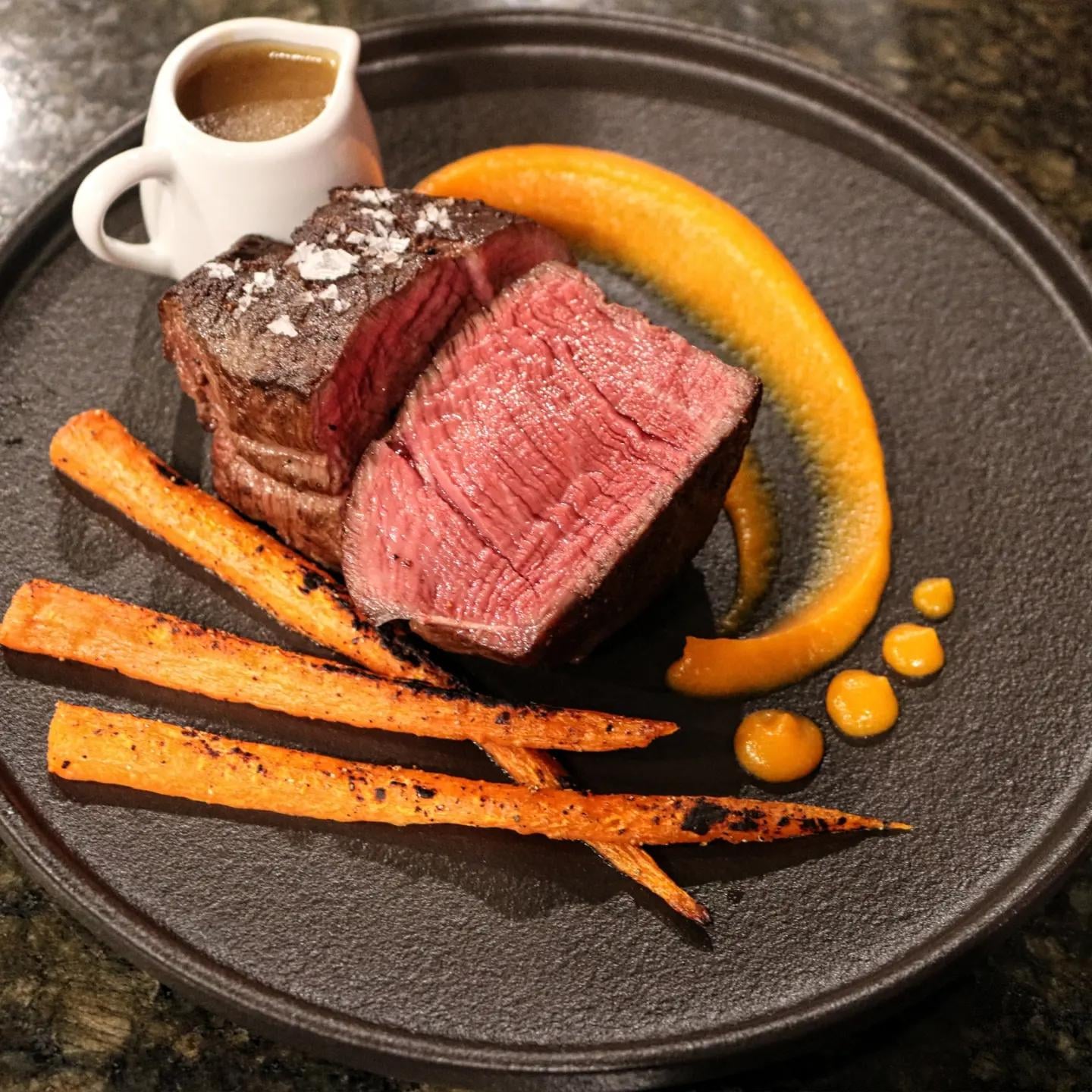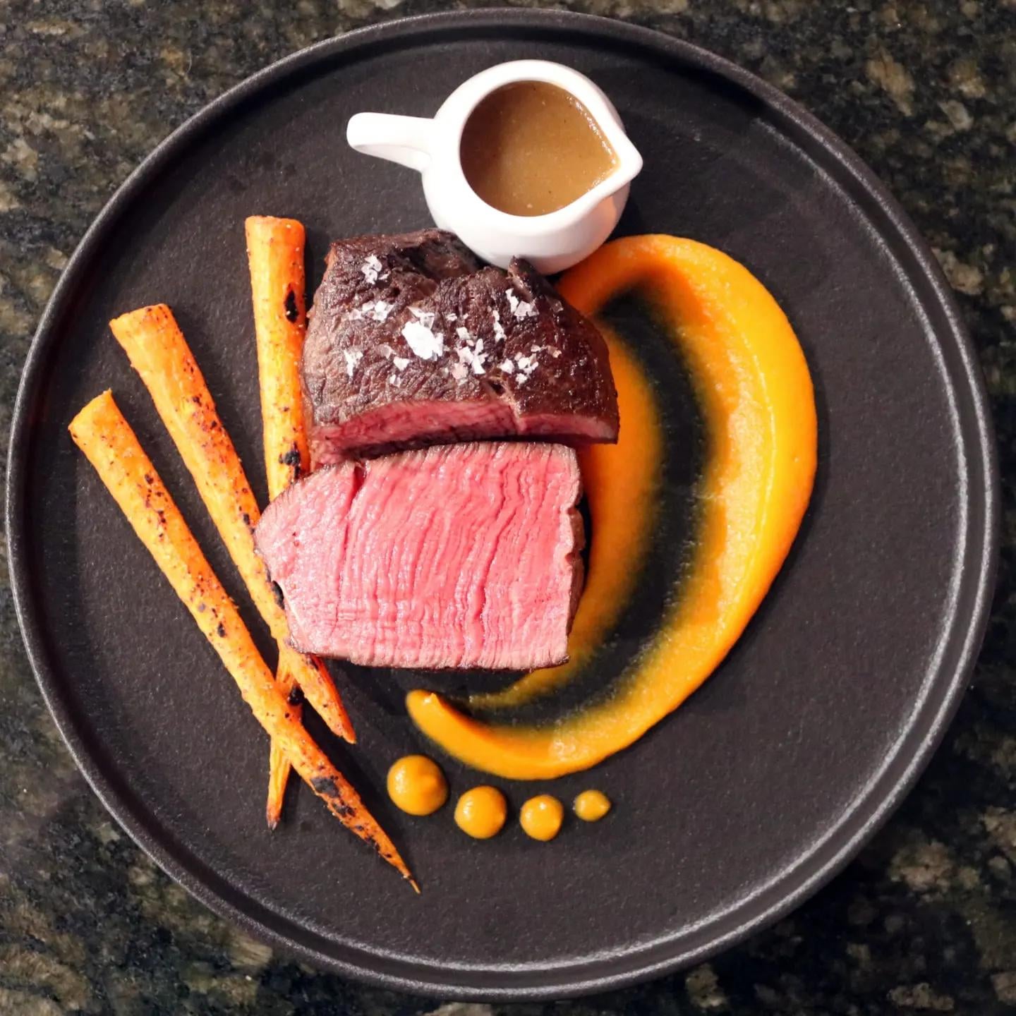 白いお皿にオレンジのニンジンピュレ、中央にグレービーをまとめて、ソースボートなしでステーキを乗せ、サイドにレインボーキャロット(変わった色のやつだけ)、そこにチミチュリか緑のオイルかピュレを加えたら最高じゃない?