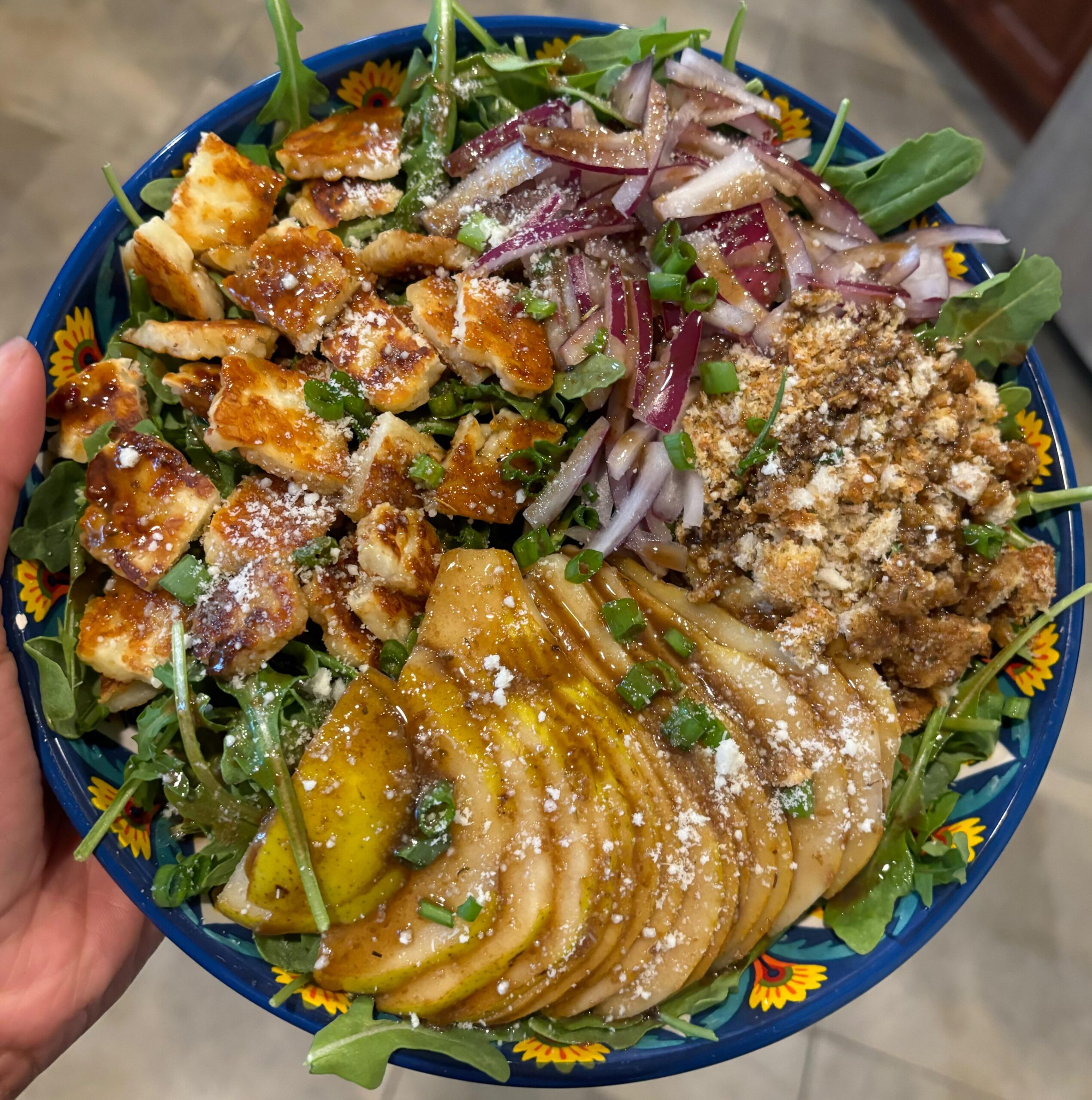 ・ルッコラにグリルしたハルーミチーズ、洋梨、バルサミコビネグレットを合わせた本格サラダ