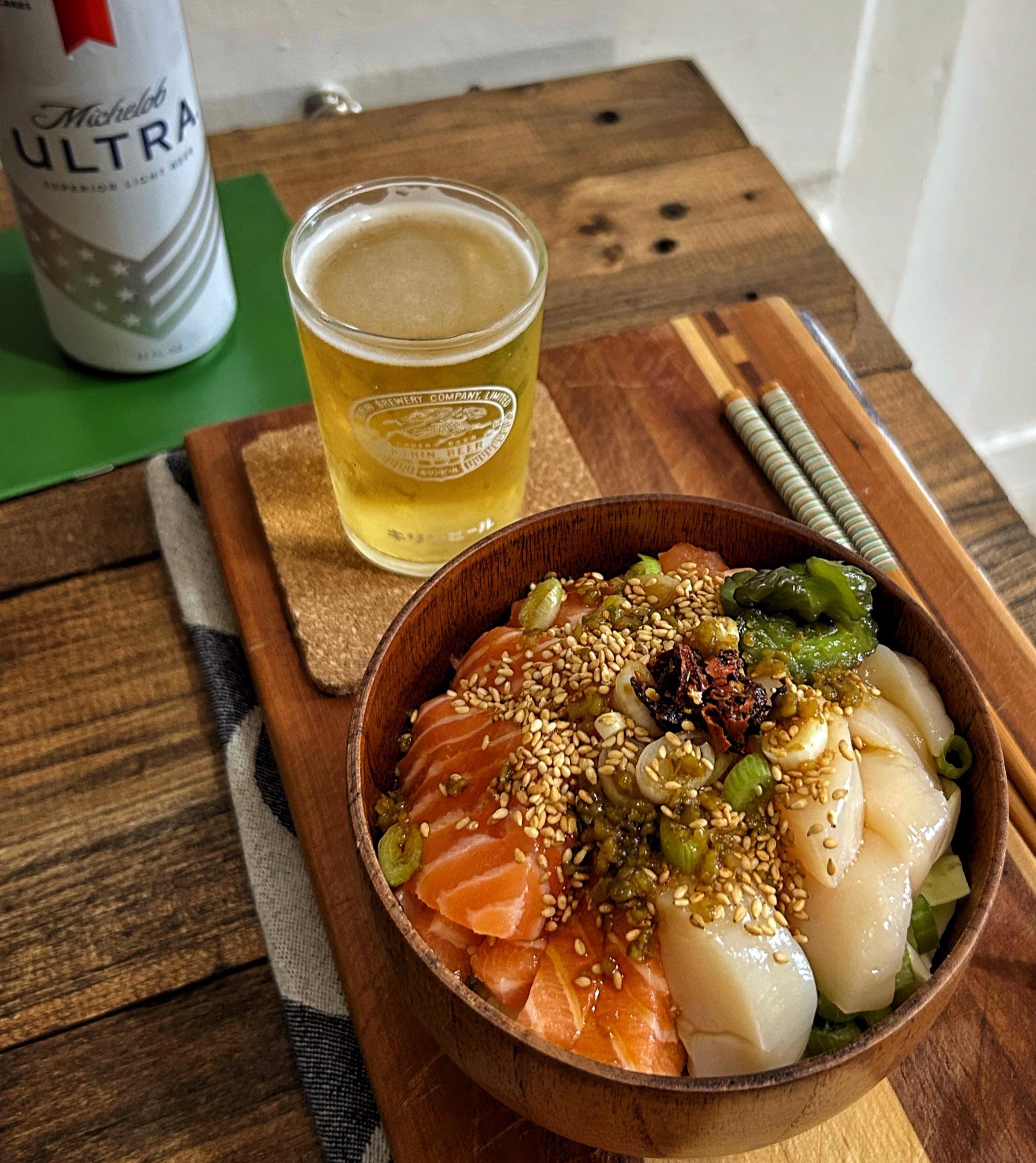 ・14ヶ月の就職活動を経てついに内定をゲットした投稿者が、北海道産帆立とフィヨルドサーモンを使った海鮮丼で祝う動画。