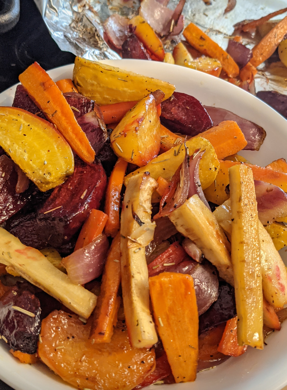 ニンジン、パースニップ、赤タマネギ、ビーツ、ゴールデンビーツをダックファット少量(大さじ1杯でも十分効く)で和えて、塩・コショウ・ローズマリーで味付けし、少し焦げ目がつくまでローストするだけ。
