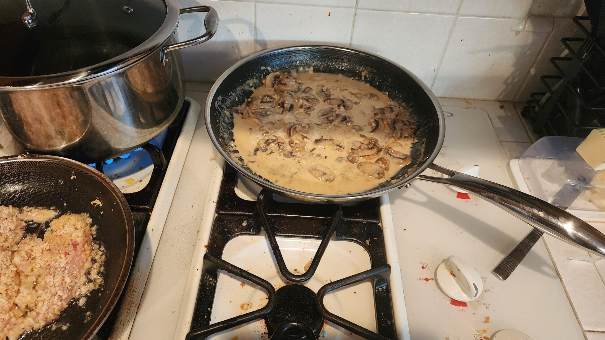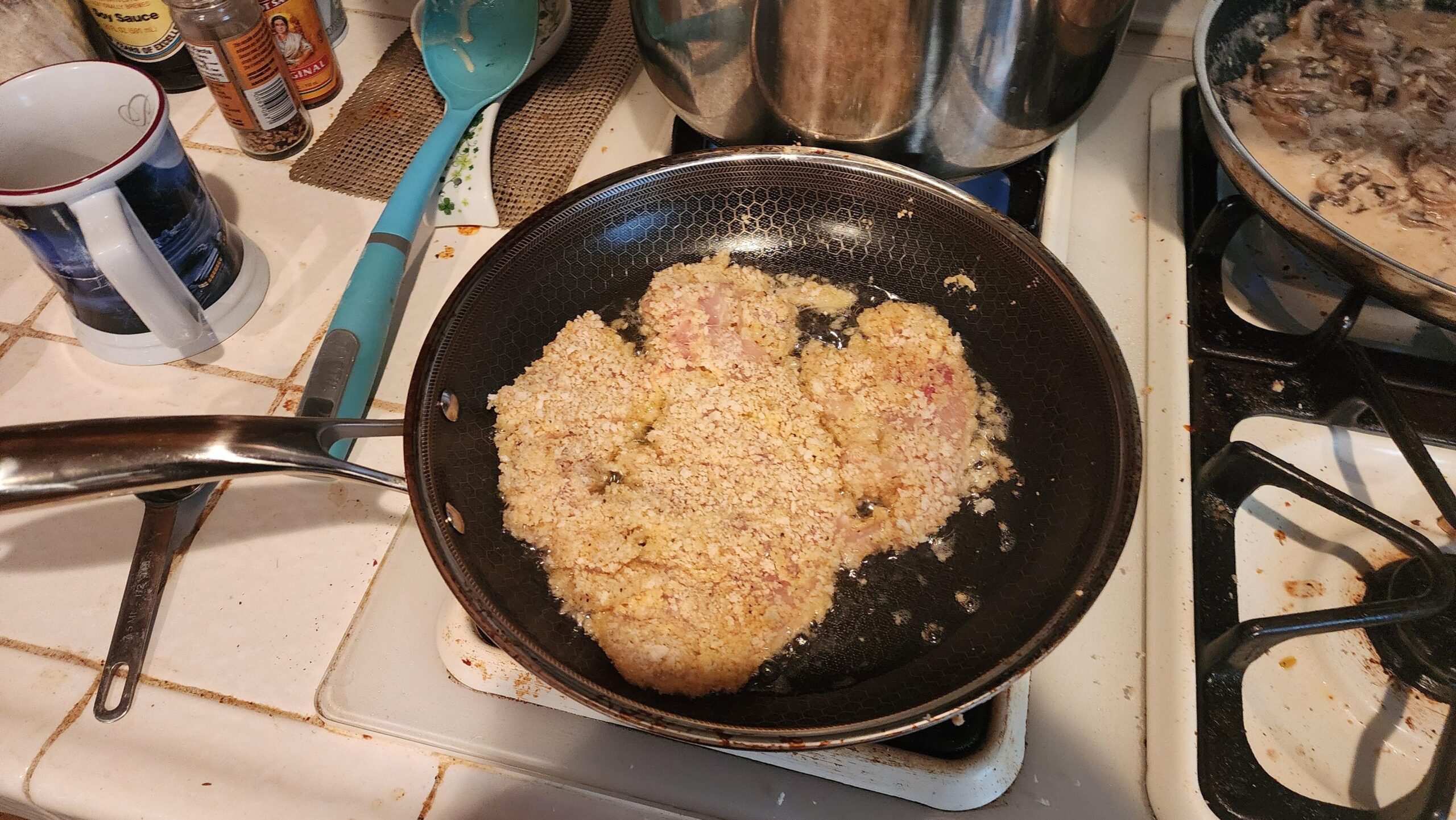 妊娠中の妻がチキン・シュニッツェル(マルサラソースはワインなしでチキンブロス使用)と手打ちパスタを食べたいと言うので作ったんだけど、いざ食べてみたら「もういらない」って言われた(ため息)。