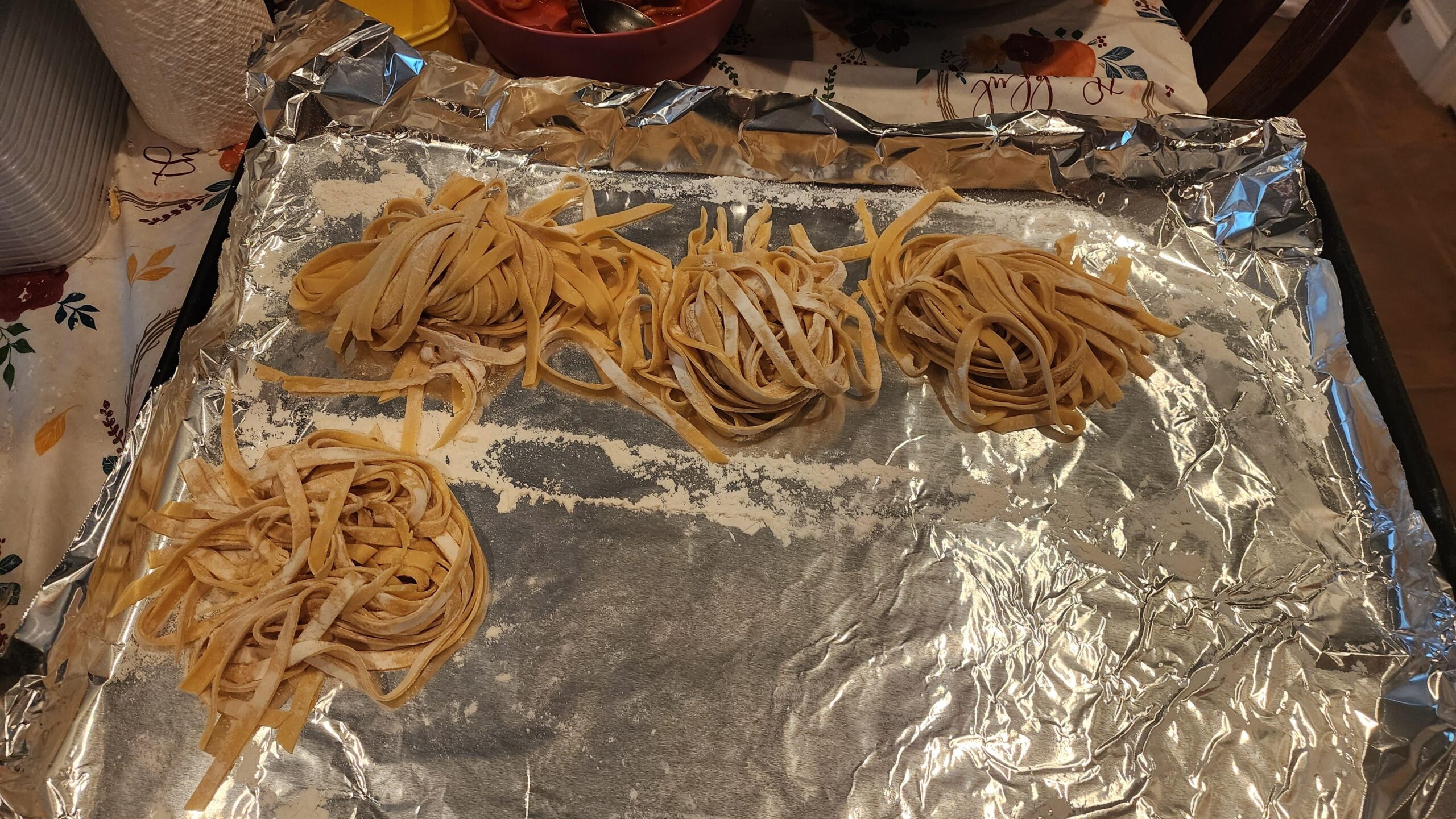 1. パスタ生地を練り、伸ばして好みの太さに切り、茹でる。