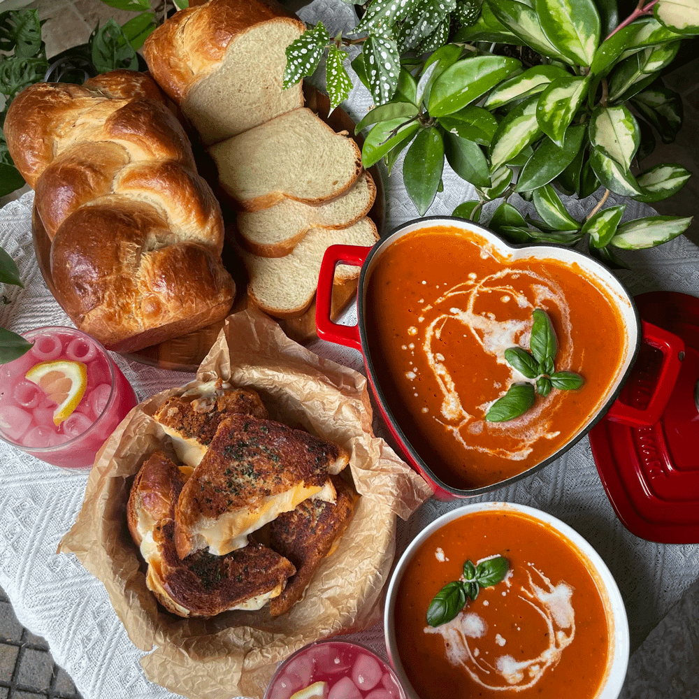 彼氏がトマトスープを食べたいと言ったので、ブリオッシュ(Brioche)を焼くところからはじめて、ローストガーリック&バジルのトマトスープとガーリックバターのグリルドチーズサンド(Grilled Cheese Sandwich)を作りました!