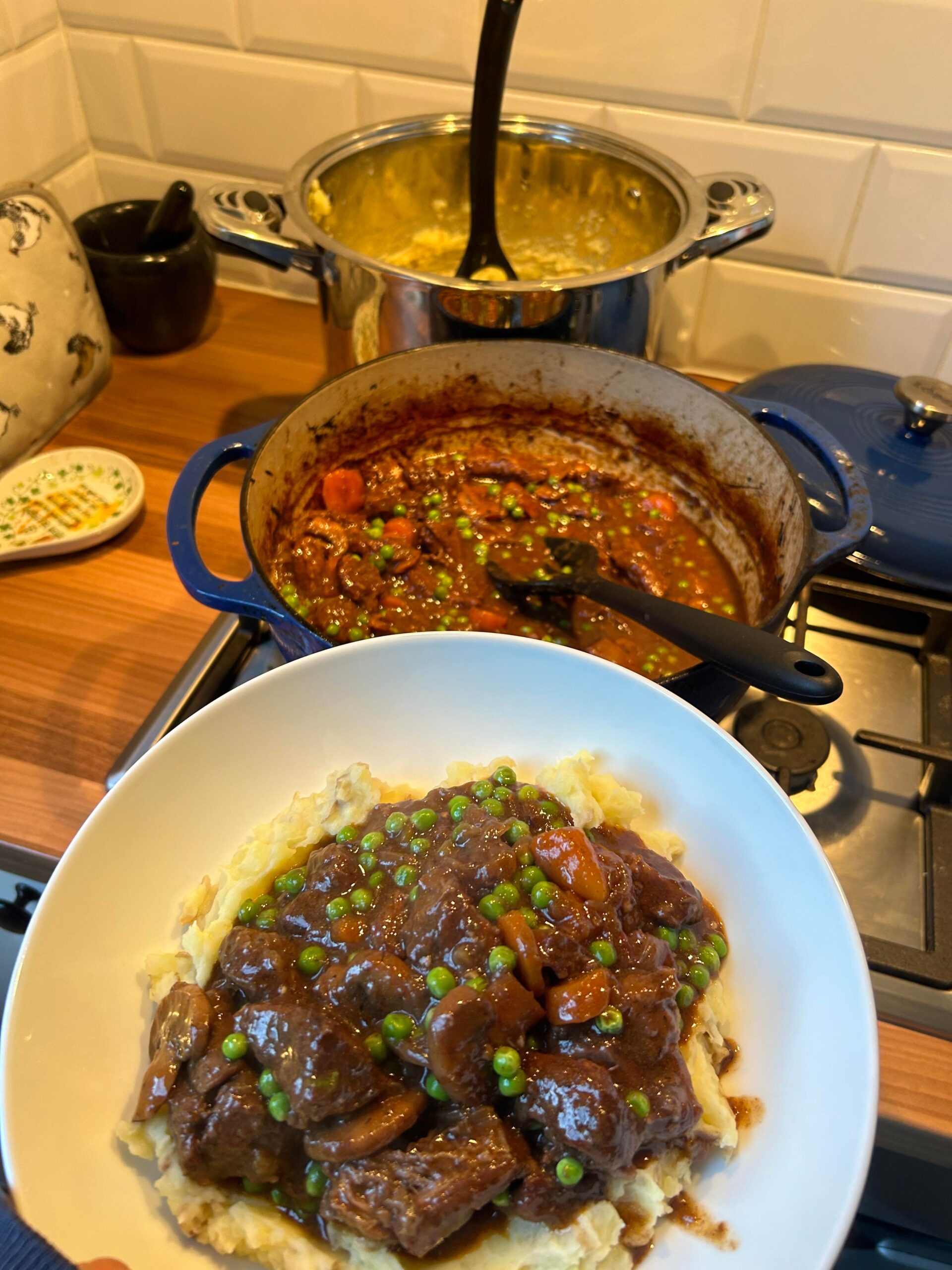 4. お皿にマッシュポテトを盛り、その上からたっぷりとシチューをかける。