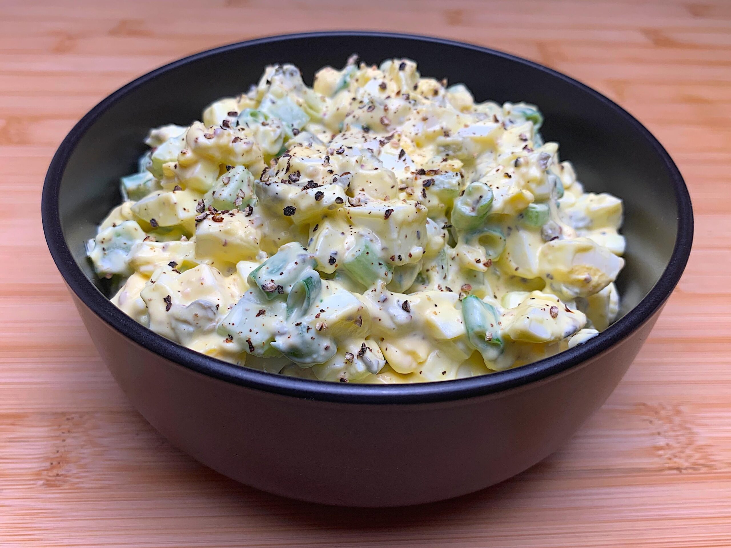 ゆで卵(Boiled Eggs)6個、セロリ1本みじん切り、ディルジャーキン(Dill Gherkin)2本みじん切り、万能ねぎ2本(白い部分も)薄切り、ケイパー(Capers)大さじ山盛り1杯をつぶしてみじん切り、粒マスタード(Stone Ground Mustard)小さじ1.5、タンギーマヨ大さじ3。