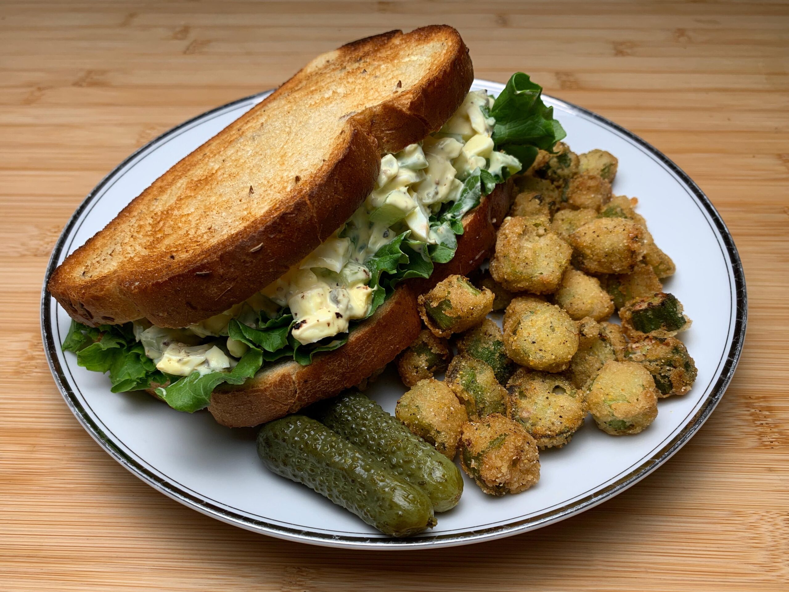 フライドオクラ(Fried Okra)とピクルスの組み合わせ、めちゃ良さそう。このゆで卵の組み合わせにフライドチキン(Fried Chicken)も足したくなってきたわwww