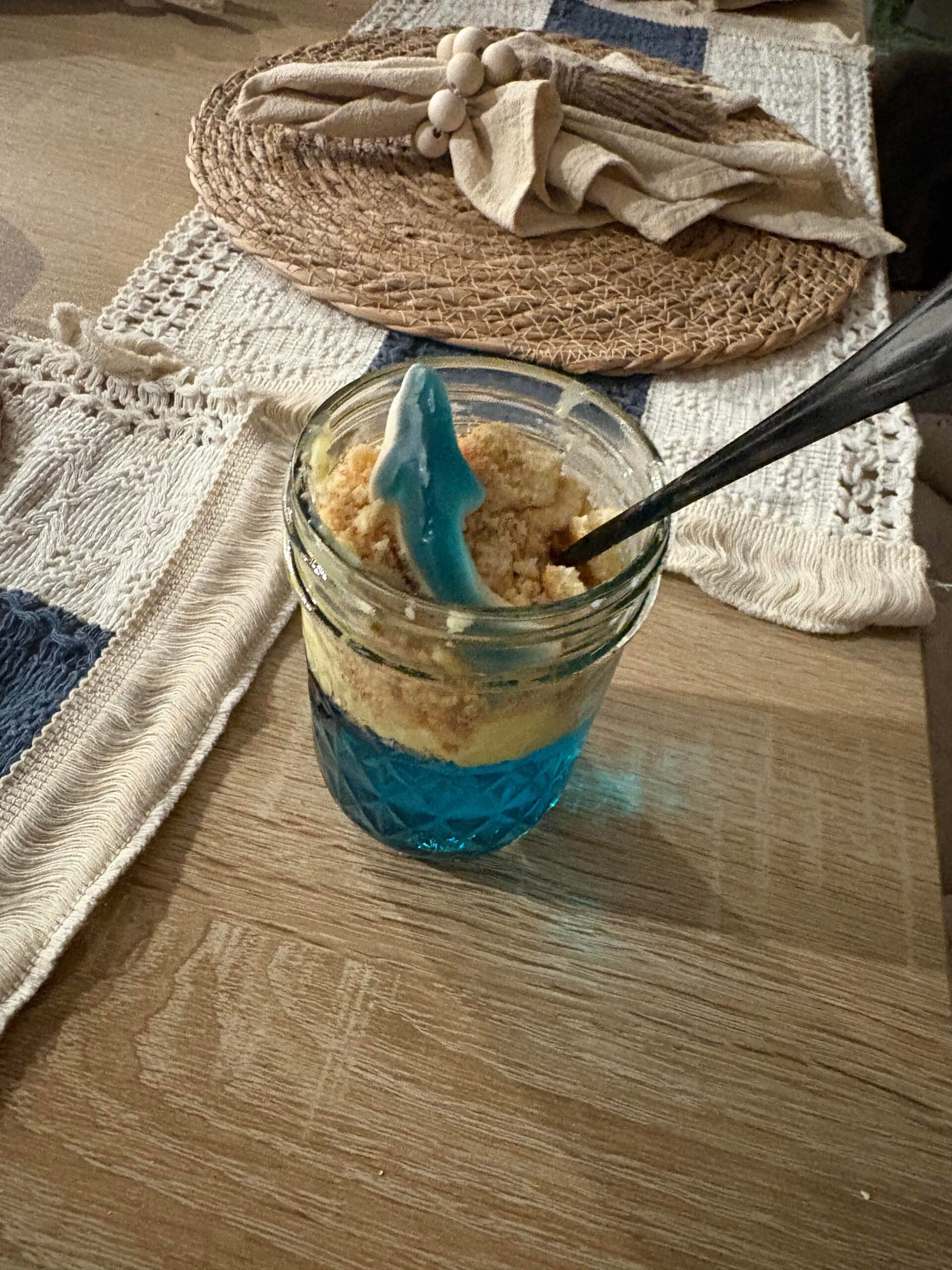 ブルーラズベリー味のゼリー(ジェロー/Jell-O)にクリームとクッキーを合わせたサメだよ笑😂