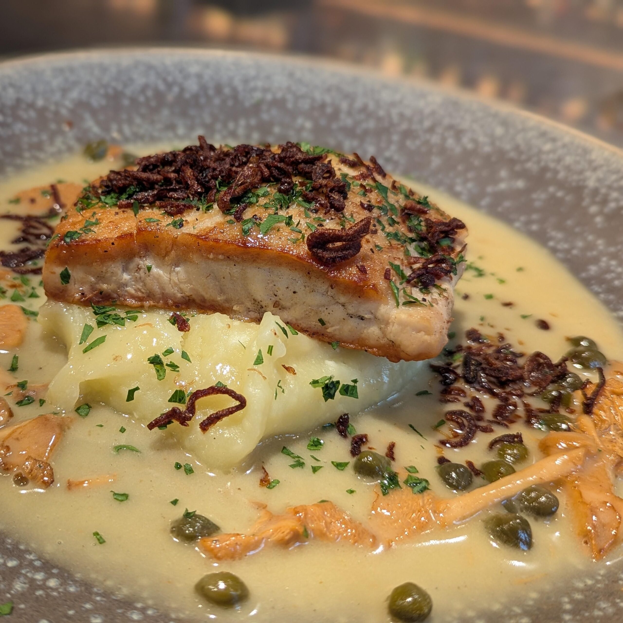 バター風味のマッシュポテト、レモンケッパーソース、野生のきのこ、サクサクのエシャロット添え。