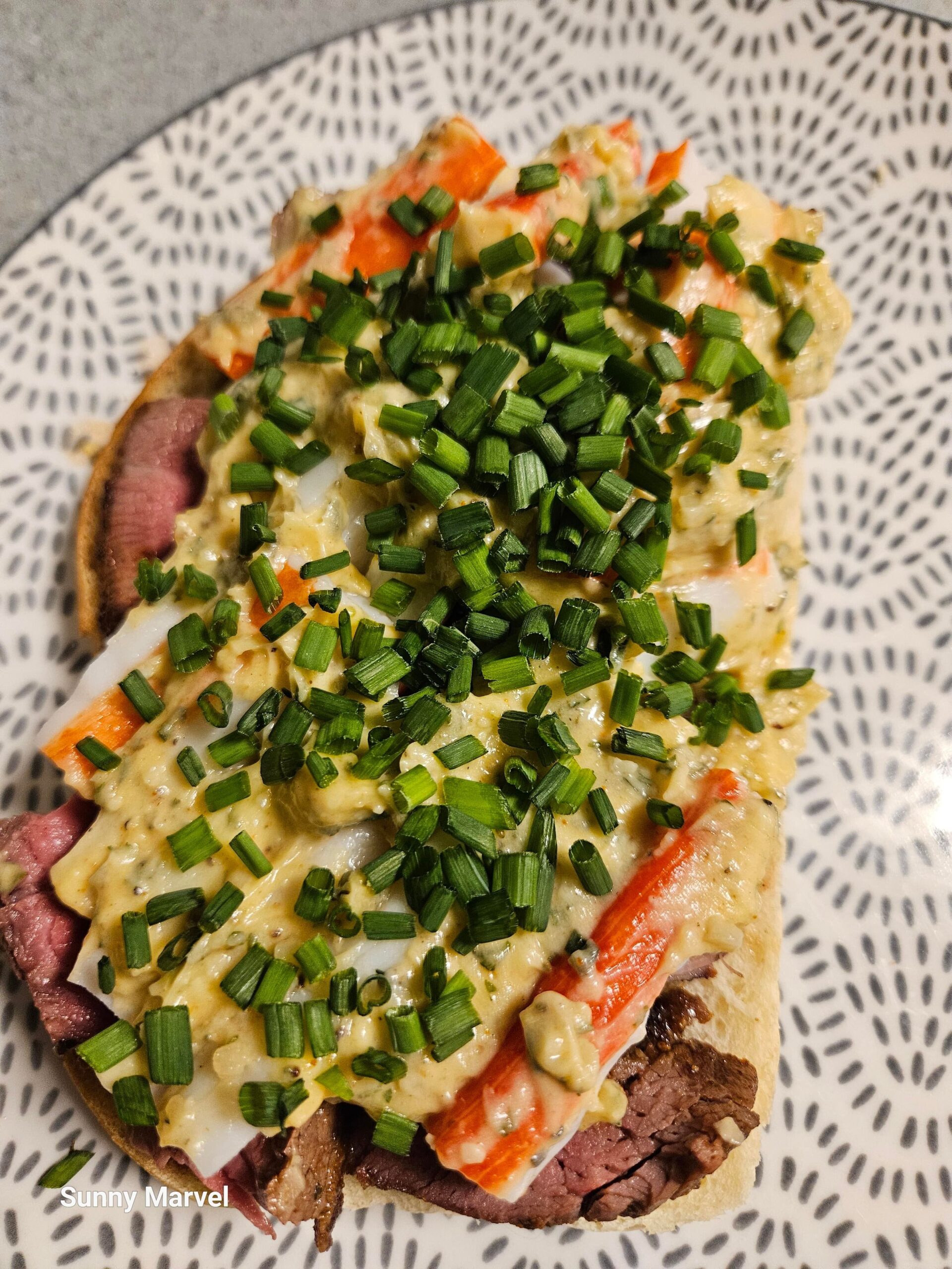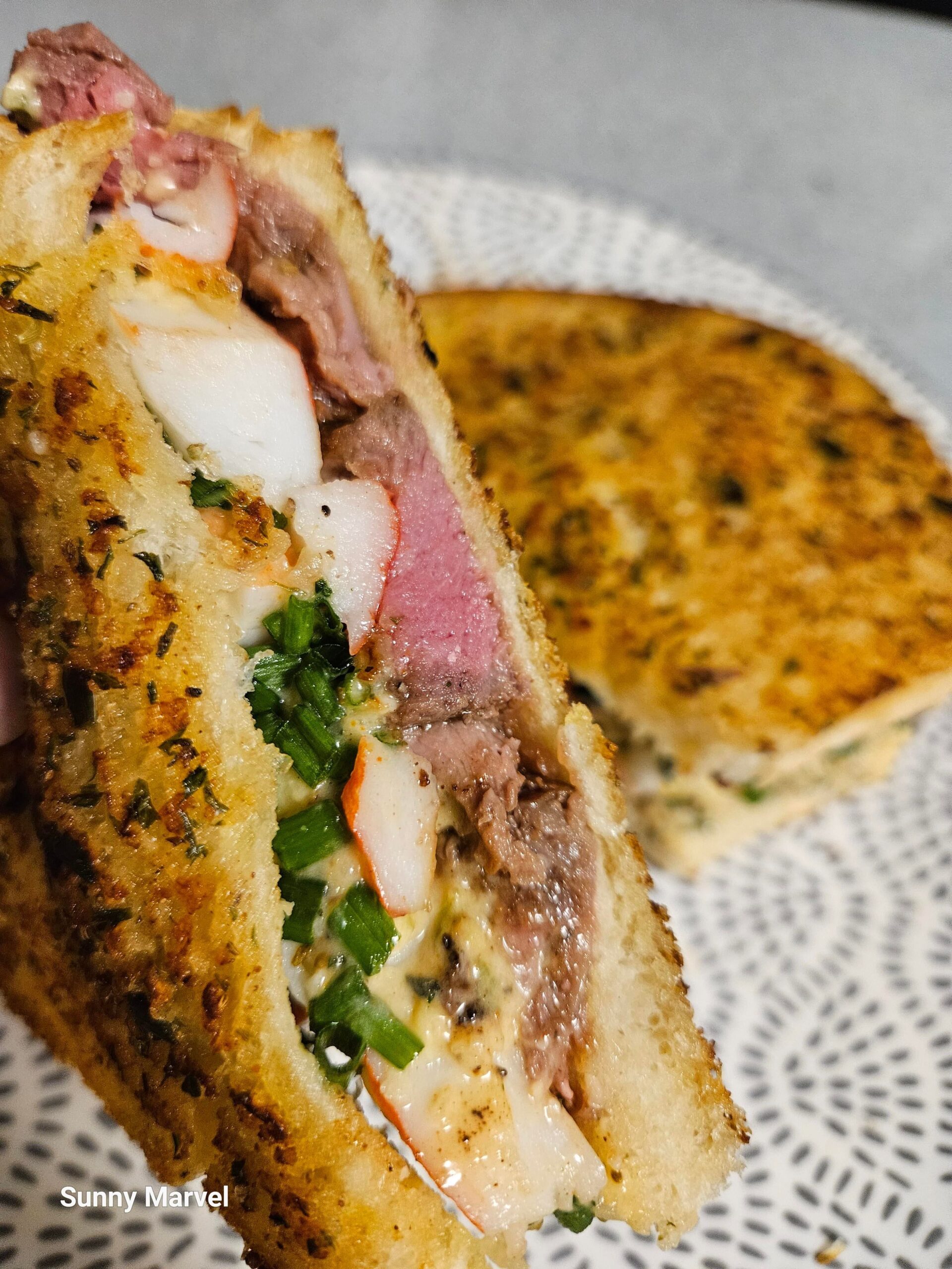 「今日は健康も予算も全部窓から投げ捨てた」と言いながら作られたのは、ガーリック・オレガノ・パセリ・チャイブ・オールドベイ・パルメザン入りのバタースプレッドをサワードウに塗り、レア焼きフィレミニョンの薄切りとカニカマをどっさり乗せた贅沢サンドイッチ(Steak Sandwich)。見た人全員が「腹減った」「ダイエット終了」と悲鳴を上げる、罪深すぎる一品の記録。
