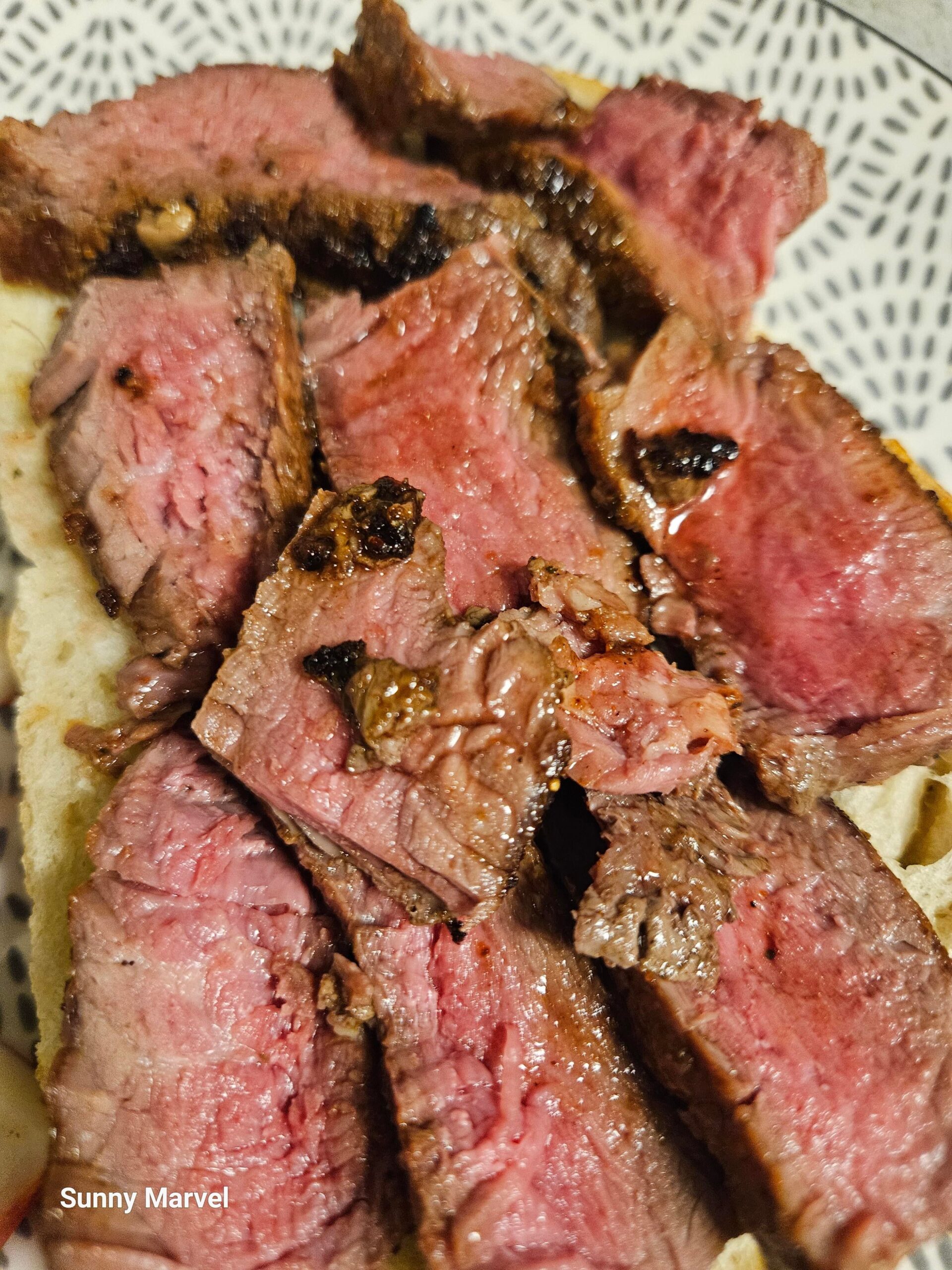・フィレミニョン(Filet Mignon)のメダリオンをレアに焼いて薄切りにし、サワードウにオン