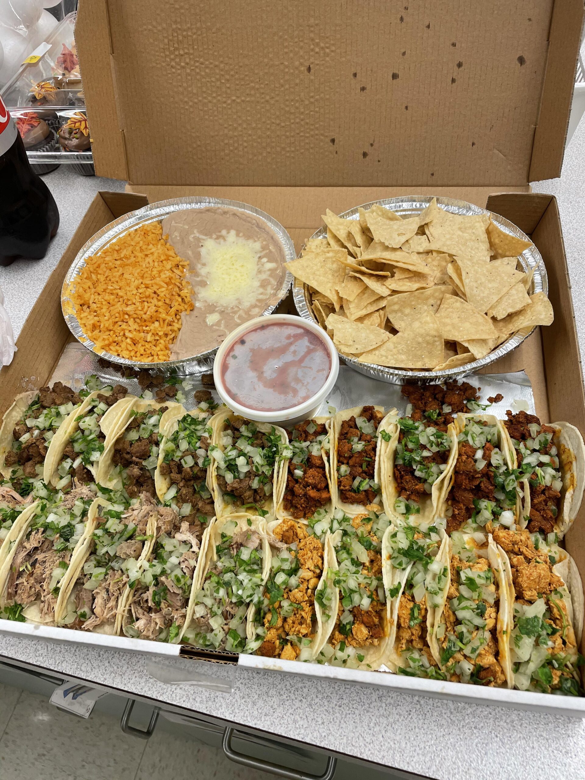 アル・パストール、カルニタス、チキンなど種類豊富なタコスが並び、ライス&ビーンズ、チップス&サルサも付いた豪華セット。
